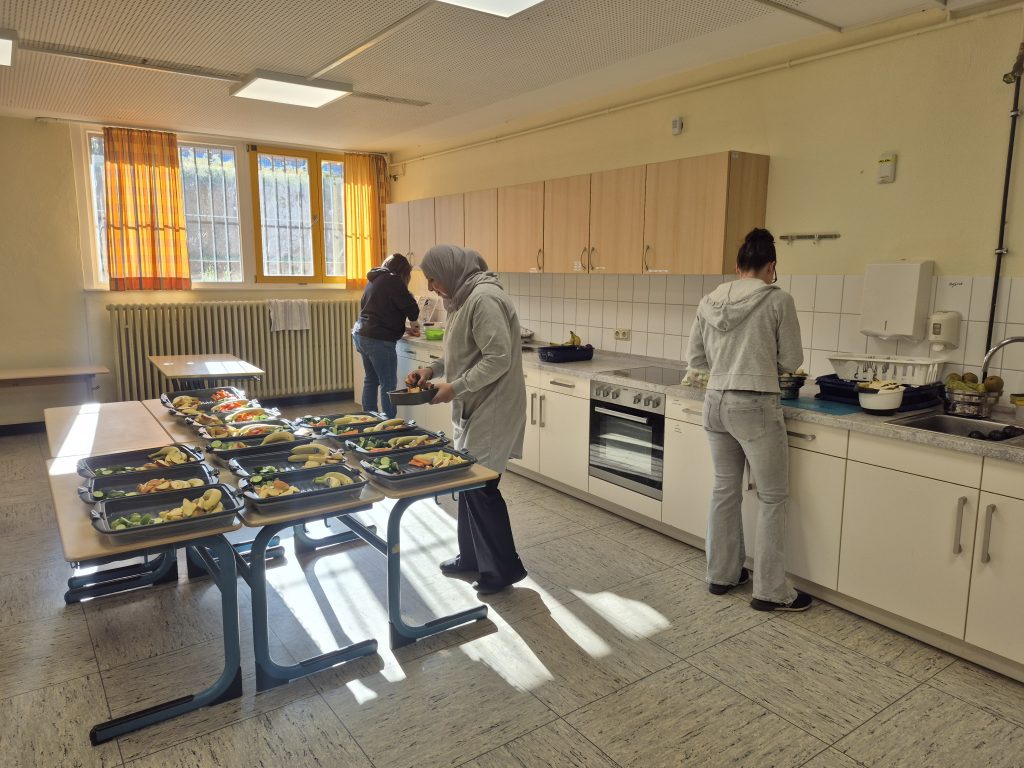 Die Klassen schicken dann ihren Obst-Dienst zum Abholen der appetitlich angerichteten Tabletts.