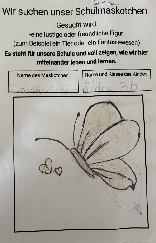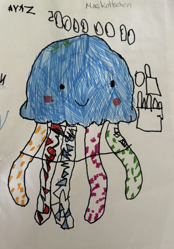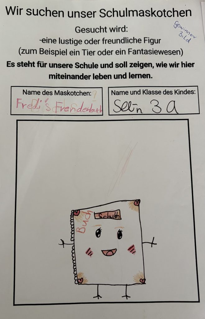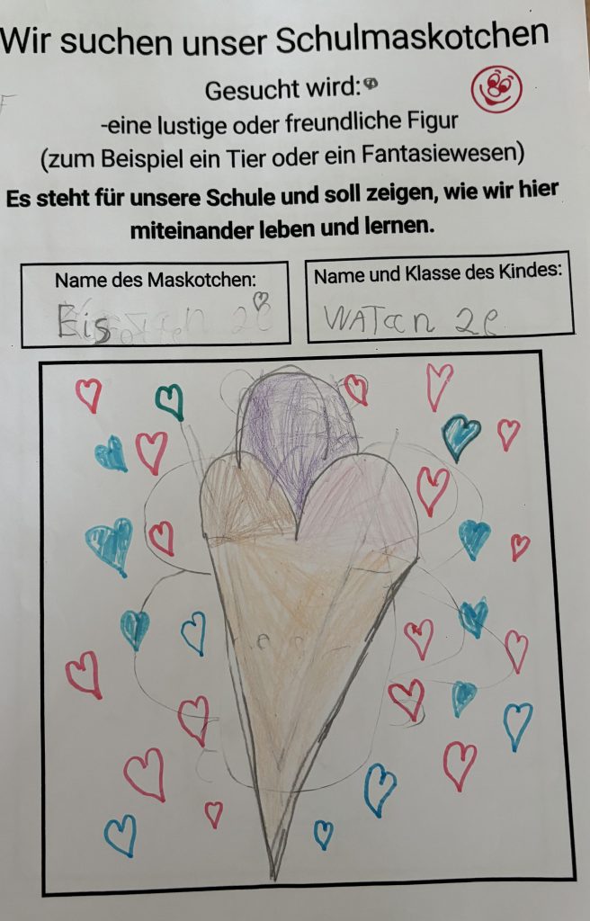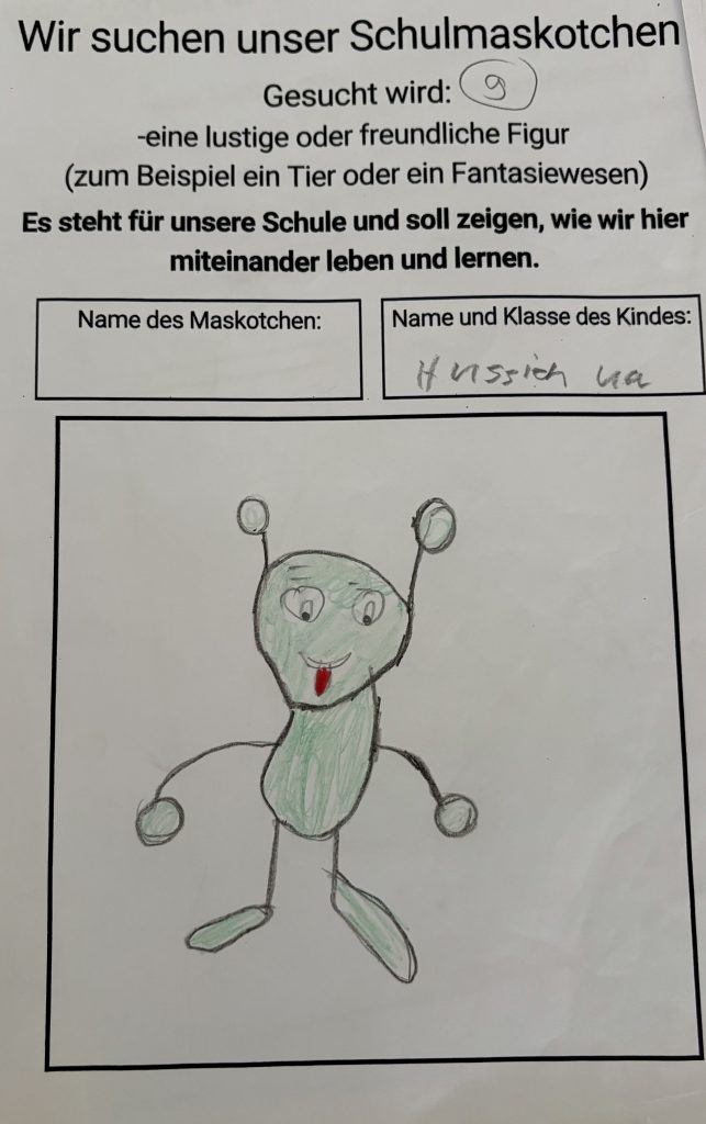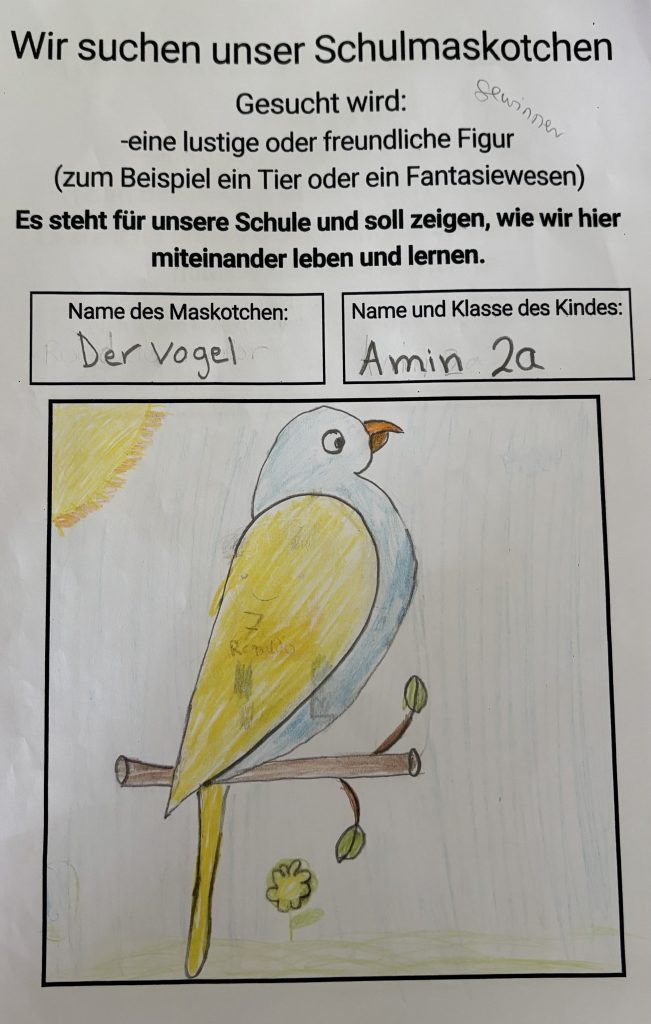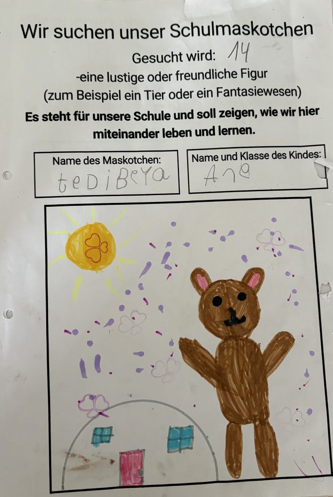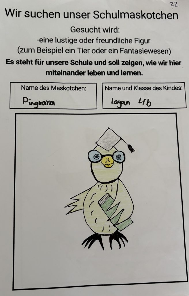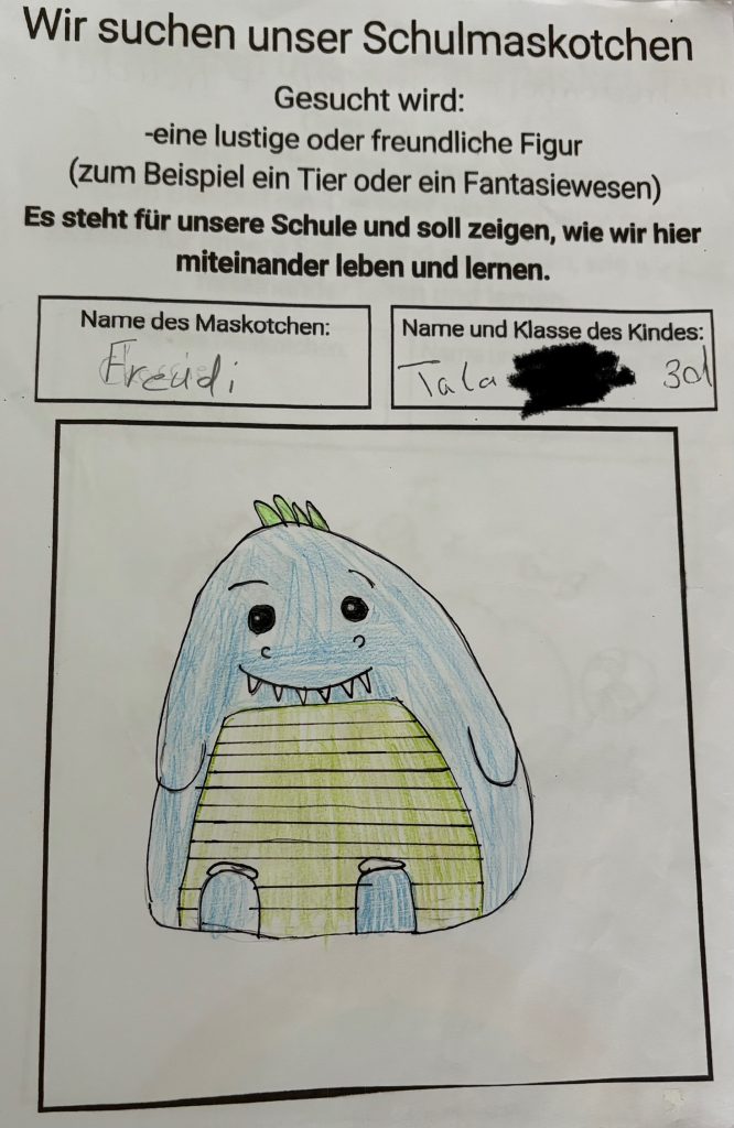 „Ein Schulmaskottchen ist was ganz Wichtiges für unsere Schule, das uns das ganze Jahr begleitet. Jedes Kind auf dieser Schule (wer wollte) durfte ein Maskottchen malen und dann stimmt die Klasse ab, wer das schönste Maskottchen gemalt hat. Und dann jedes Maskottchen, das am schönsten von jeder Klasse war, hat gewonnen. Die besten Maskottchen werden wieder abgestimmt und dann das beste Maskottchen hat gewonnen und wird unser Schulmaskottchen. „ Lamar 3a